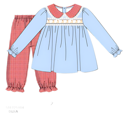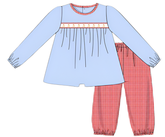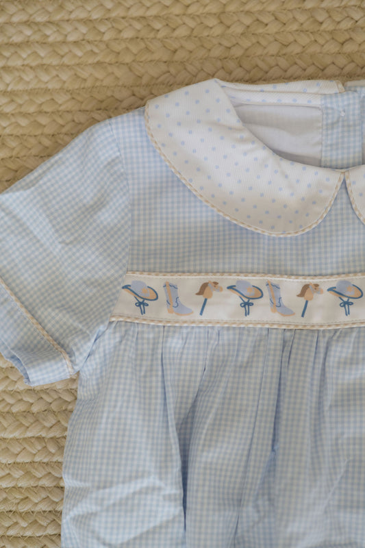 November Arrival Pima Cotton Blue Gingham Bubble Pant (Tractor Ribbon Match)