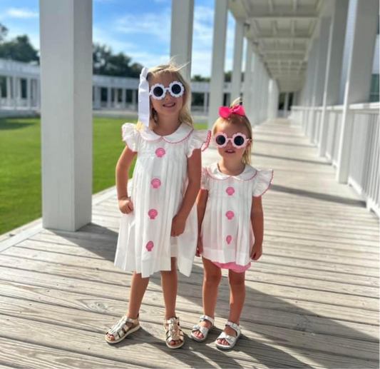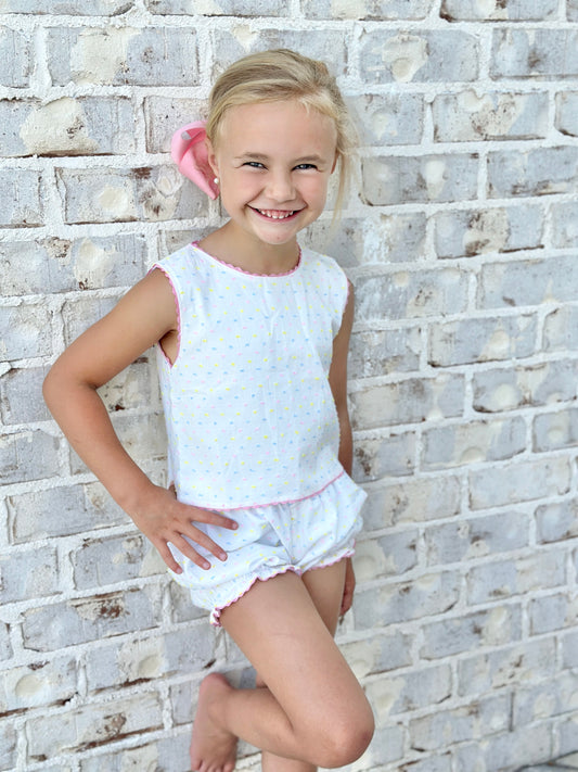 Confetti Swiss Dot Swing Back (A line Top & Bloomers 12m-3t, Straight Cut Top & Shortie shorts 4t-7y)