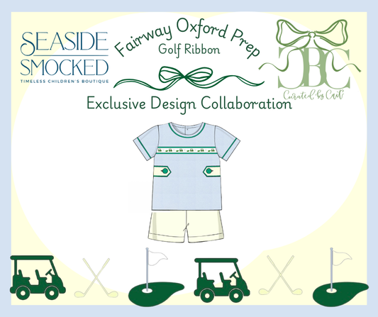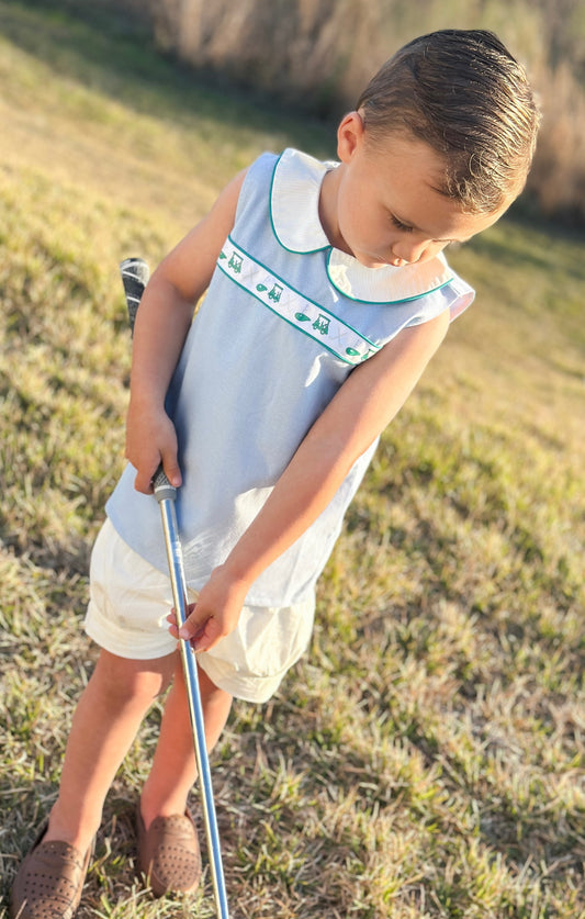 Boys Golf Ribbon Blue Oxford Fabric & Yellow Mini Stripe Banded Shortie Set