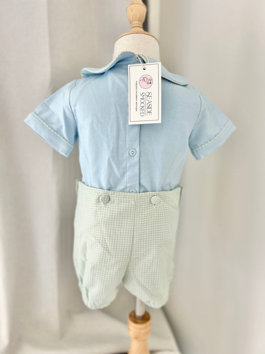Boys Chapel Blue Linen Top, Sage Windowpane Button On Shorts